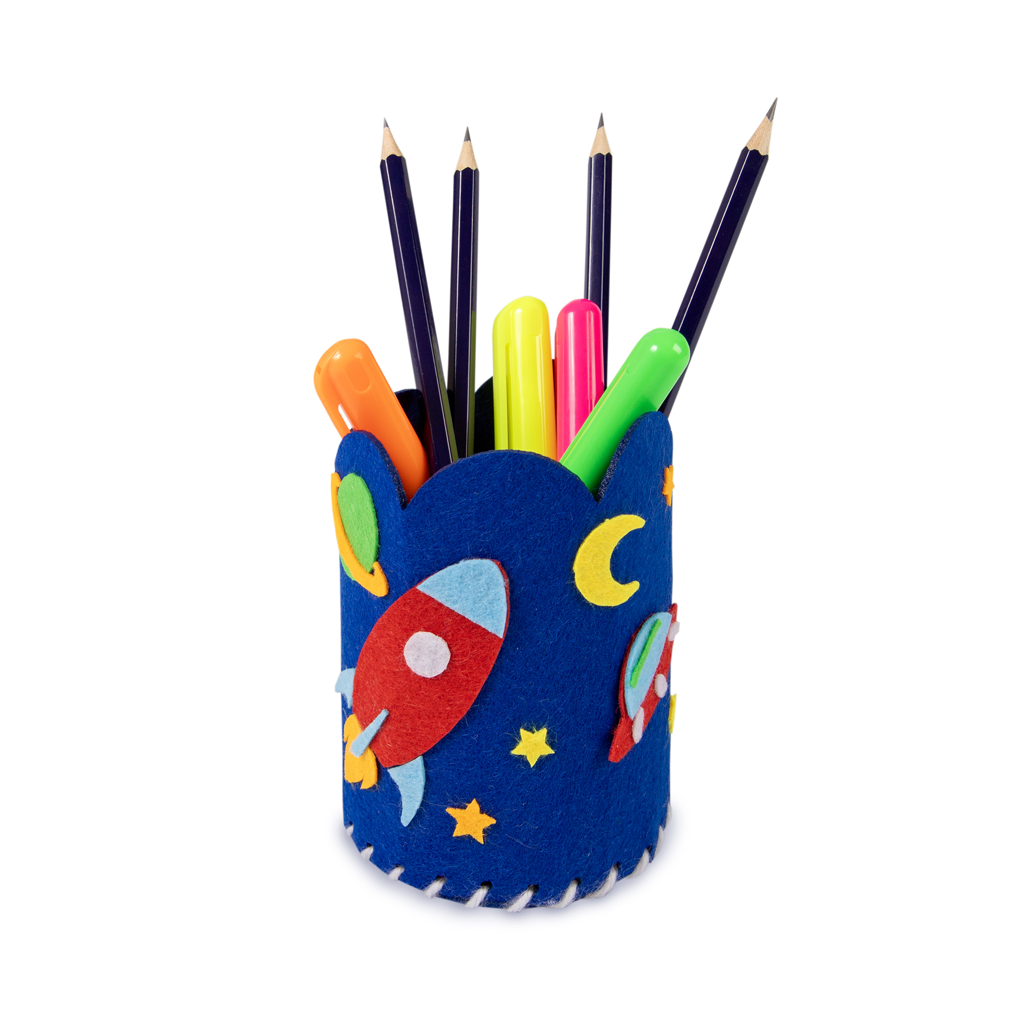 Zábavná sada z edice Vyrob si, se kterou si malí umělci ušijí a ozdobí svůj držák na tužky a pastelky. Motivy vesmíru vnesou do všech domovů špetku dobrodružství. Tato kreativní aktivita, která podporuje jemnou motoriku, je díky plastové jehle vhodná pro děti od 6 let. Sada obsahuje: plastovou jehlu, přízi na sešití, perforované tělo držáku na tužky a perforované kruhové dno, textilní samolepky na dekorování.