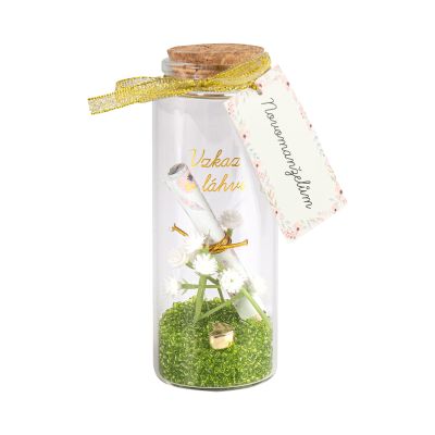 Darujte originální vzkaz v láhvi, který za vás řekne naprosto vše! elegantní lahvička je vyplněná barevnými korálky, umělými květinkami a vzkazem v ruličce. Díky štítku na láhvi si obdarovaný může vzkaz přečíst bez nutnosti ruličku uvnitř láhve otevírat.  Korkové víčko je obvázané zlatou stuhou a dokonale tak podtrhává celkový dojem.  Materiál láhve: sklo Materiál víčka: korek Rozměry láhve: výška 12,5 cm, průměr 4,5 cm