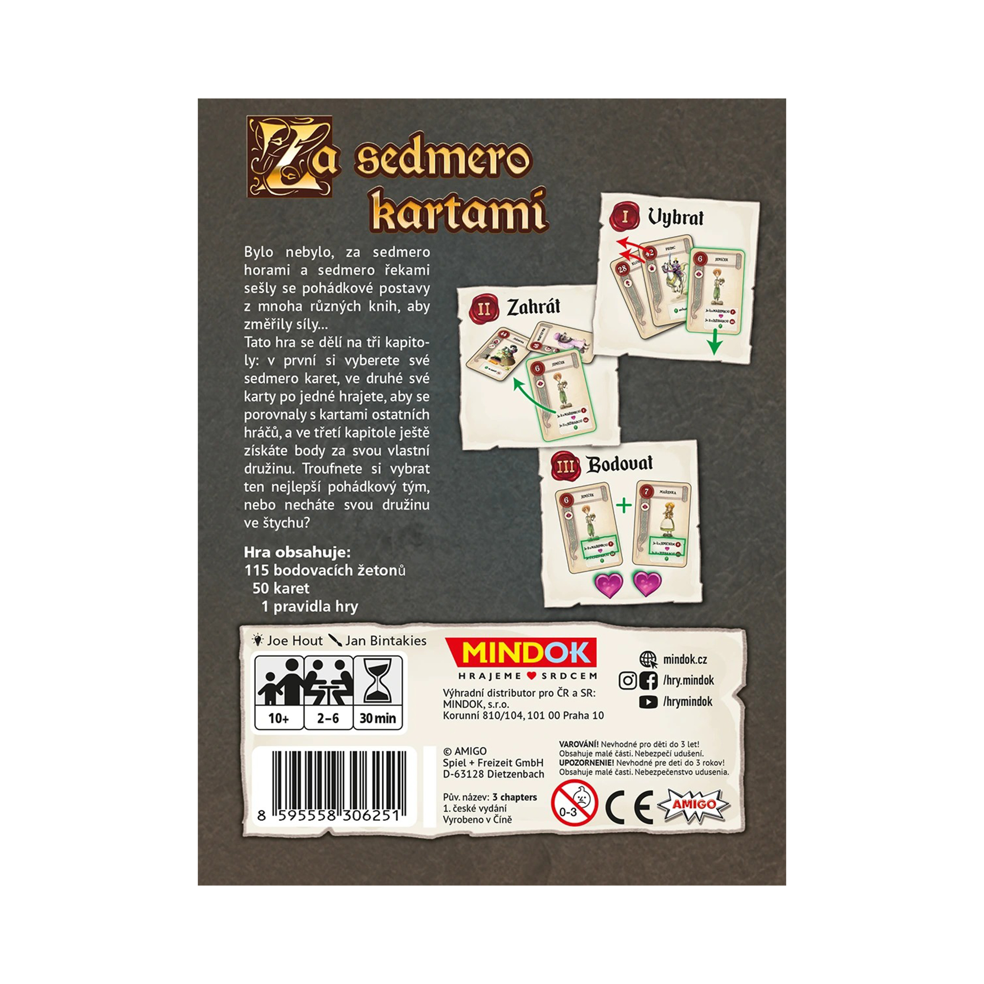Za sedmero kartami je karetní hra s pohádkovou tematikou, ve které se hráči snaží poskládat co nejvýhodnější kombinace postav a získat tak co nejvíce bodů. Herní systém chytře spojuje draftování – tedy postupné vybírání karet z nabídky, štychovou hru, kde hráči hrají karty do společné hromádky a vítěz bere celý štych, a nakonec bodování na základě splněných podmínek. Hra se odehrává ve 3 na sebe navazujících fázích – tzv. kapitolách. V první si hráči vybírají své karty, v druhé hrají karetní štychy a ve třetí části vyhodnocují své kombinace a získávají body. Každá karta představuje jedinečnou pohádkovou postavu se specifickými schopnostmi, které ovlivňují průběh hry i finální skóre. Hra Za sedmero kartami obsahuje: 50 karet, 115 bodovacích žetonů, pravidla.