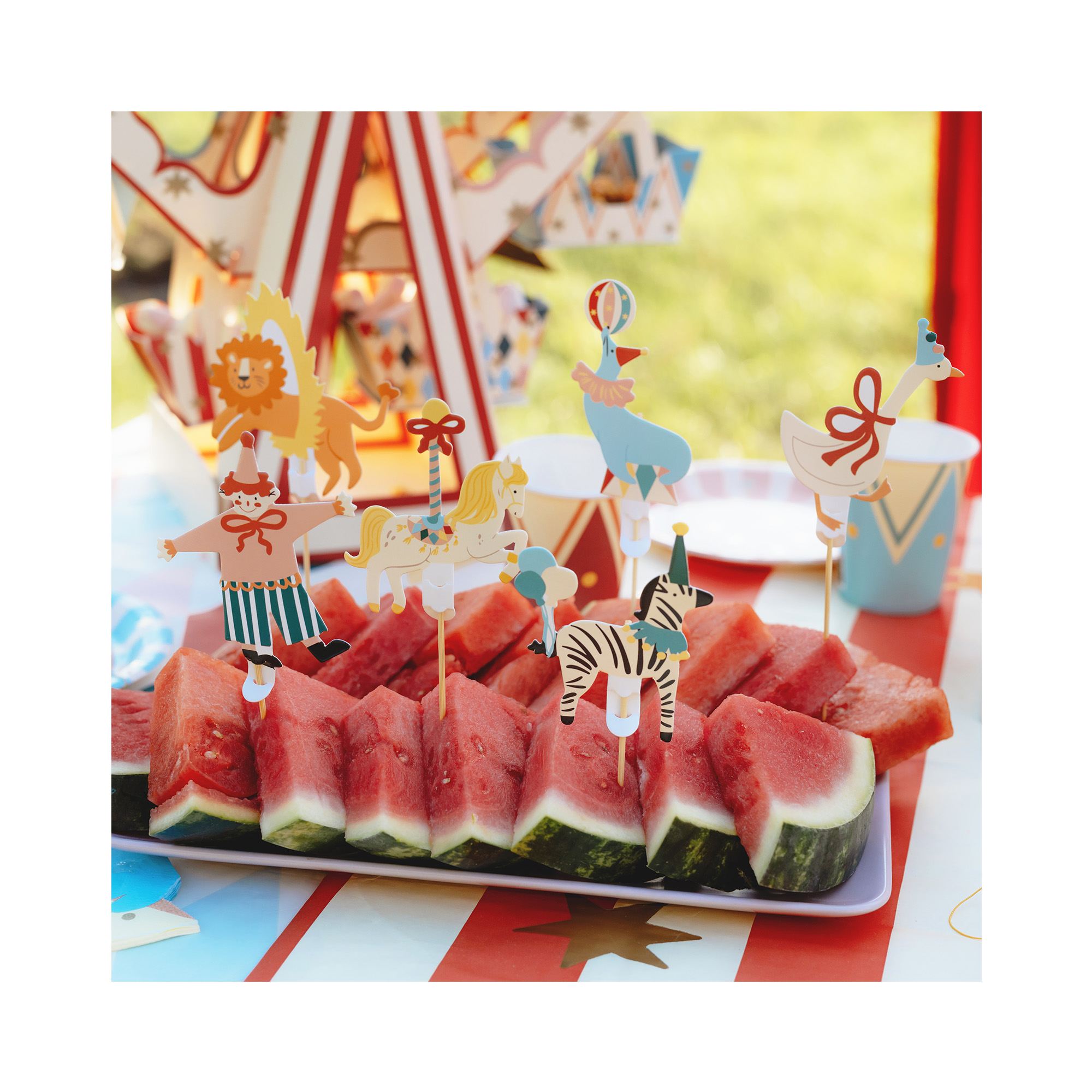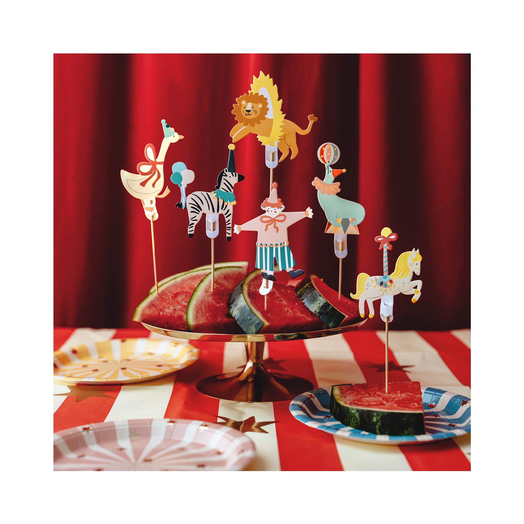 Veselá sada zápichů s cirkusovými motivy je skvělou ozdobou na cupcake a další dobroty na párty. Zápichy dokonale doladí atmosféru tematické párty nebo dětské narozeninové oslavy. Obsahuje 6 zápichů s dřevěnou tyčinkou ve tvaru klauna, koníka z kolotoče, lva v ohnivém kruhu, tuleně s míčem, zebru s balónky a husu s čepičkou. Sada krásně ladí s dalšími párty doplňky a dekoracemi z cirkusové kolekce, která je sladěna do stejných barevných odstínů a vzorů. Další podobně barevné párty doplňky najdete v naší sekci Multicolor. Výška zápichu: 9 – 11,5 cm Balení obsahuje: 6 ks narozeninových zápichů