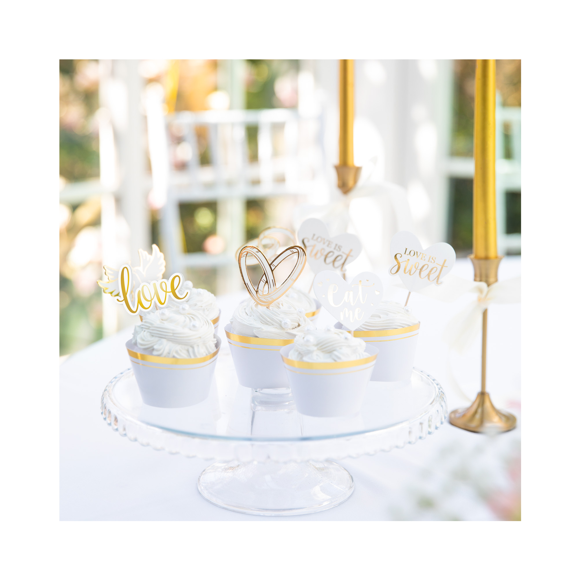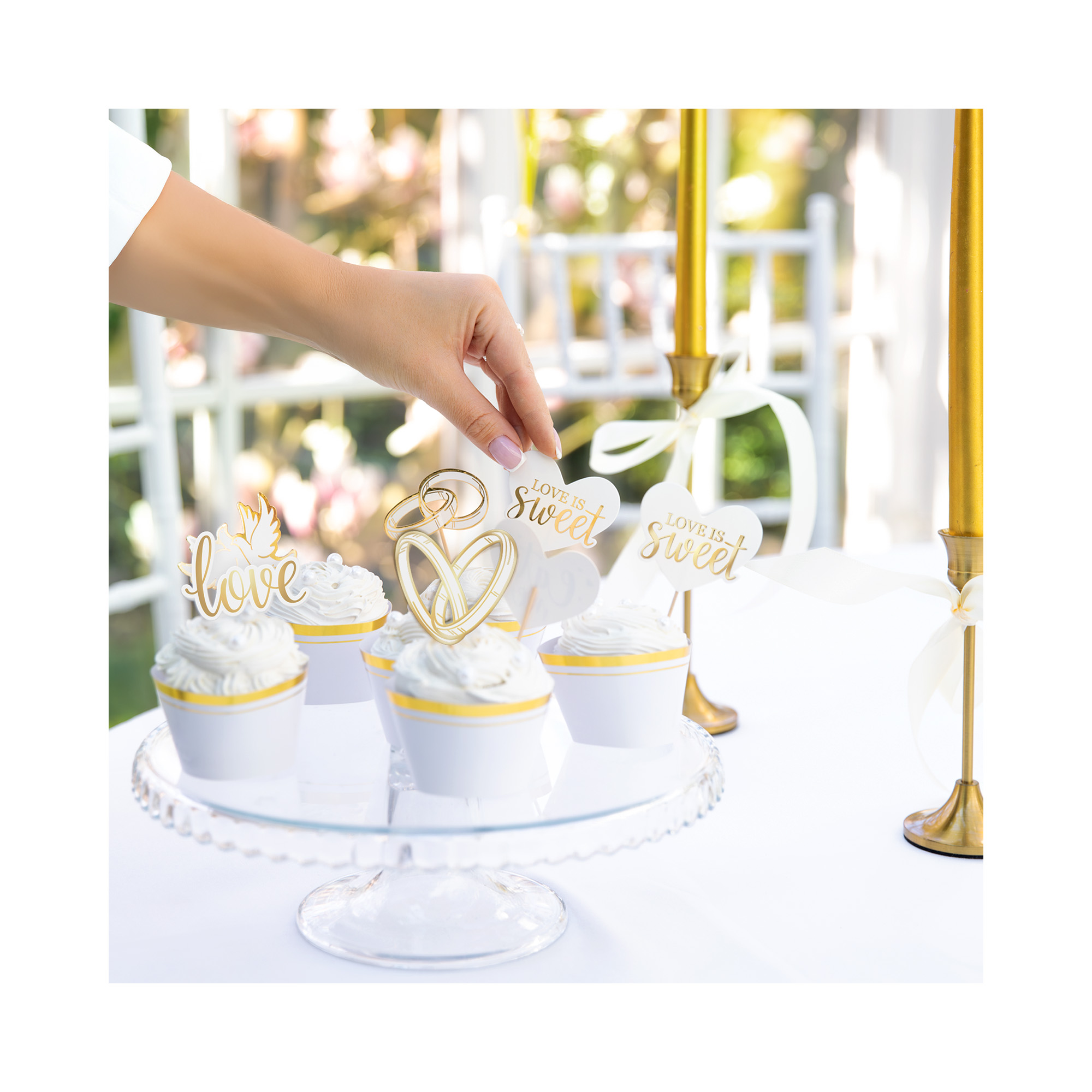 Sada dvanácti zápichů se svatebním motivem je skvělým doplňkem pro ozdobení dortíků, cupcaků a dalších dobrot na hostině. Zápichy jsou laděny do elegantní kombinace bílé barvy a zlatých detailů. Sada obsahuje 12 zápichů s dřevěnou tyčinkou ve tvaru dvou snubních prstenů, srdce s nápisem "eat me", dvou holubiček, nápisu "love" a srdce s nápisem "LOVE IS sweet". Pro další svatební doplňky a dekorace můžete navštívit naši sekci Svatba a rozlučka. Výška zápichu: 10 – 11,5 cm Balení obsahuje: 12 ks papírových zápichů na špejlích