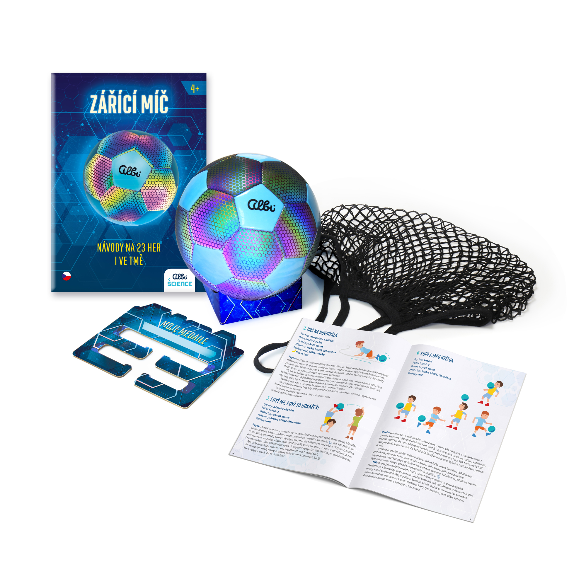 Rozpohybujte své děti se Zářícím míčem z edice Albi Science! Tento speciální míč s reflexním holografickým efektem a fosforeskujícími prvky pracuje na principu lomu světla, díky kterému na světle duhově září. Modré pentagony míče mají speciální fotoluminiscenční efekt, takže při nasvícení na sluníčku nebo pod žárovkou následně ve tmě svítí. Efekt trvá přibližně 15 minut, pak se ztrácí a celý proces „nabíjení“ světlem je potřeba zopakovat. míč tedy nevyžaduje baterie ani nabíjení. Je velmi odolný, lehký a vhodný pro vnitřní i venkovní použití. Sada Zářící míč obsahuje pravidla pro 23 zábavných míčových her určených pro jednotlivce, dvojice, skupinu i pro více skupin dětí od 4 let. Hry s míči rozvíjí obratnost a pohybové schopnosti a děti si tak zábavnou formou procvičí házení, koulení či kopání. V návodu malí sportovci najdou spoustu zajímavostí o výrobě míčů a míčových hrách. Součásti sady je navíc kartonový stojánek na míč, kartonový věšák na medaile a praktická černá bavlněná síťovka. Míč lze snadno dofouknout klasickou pumpičkou. Obvod míče: 64-66 cm (fotbalová velikost 4) Sada Zářící míč obsahuje: holografický zářící míč s fosforeskujícími prvky, stojánek na míč, věšák na medaile, bavlněnou síťovku na míč a návod.