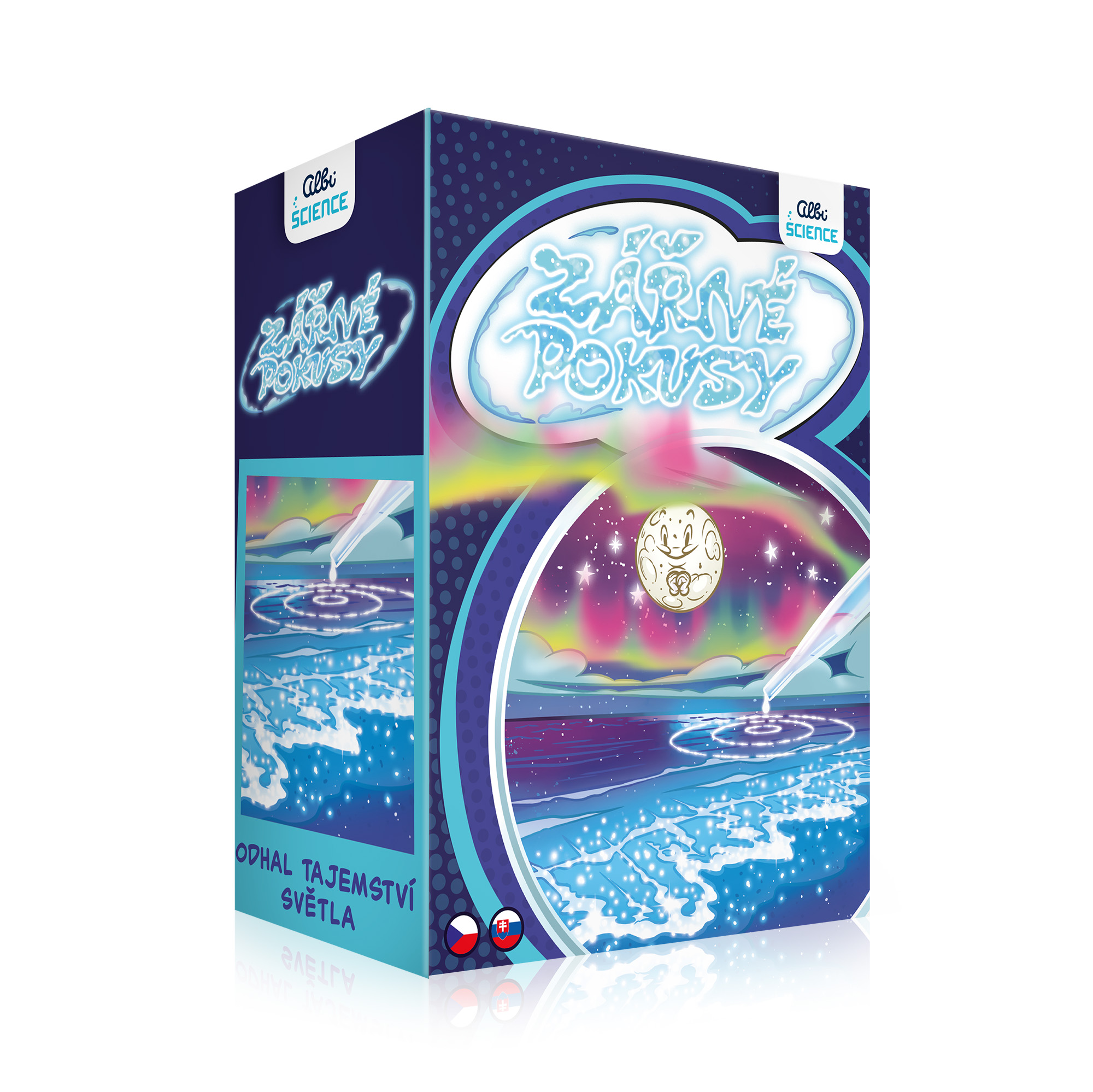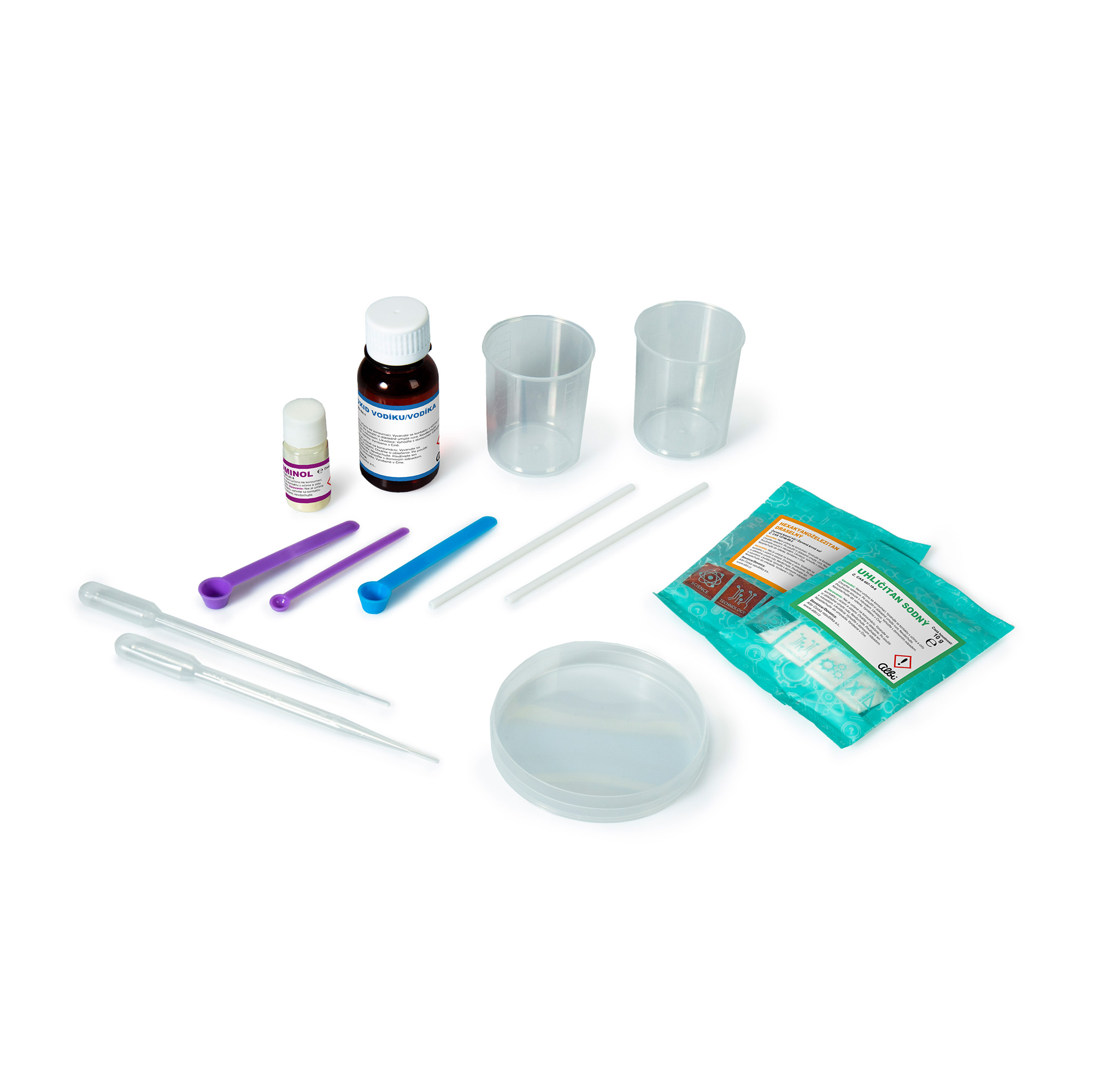 Objevte kouzlo chemiluminiscence. Zhasněte, vyrobte si zářící tekutinu a prozařte tmu chemickými pokusy. V sadě naleznete experimenty světélkující ve tmě a zajímavosti o světélkování v přírodě. Ideální zábava pro jednotlivce i skupinu. Sada Zářivé pokusy obsahuje: 1 lahvičku Luminolu, 1 sáček uhličitanu sodného (soda na praní), 1 sáček hexakyanidoželezitanu draselného, 1 sáček s lahvičkou peroxidu vodíku, 1 malá fialová lžička, 1 fialová a 1 modrá lžíce, 2 pipety, 2 míchací tyčinky, 2 odměrky, 1 petriho miska.