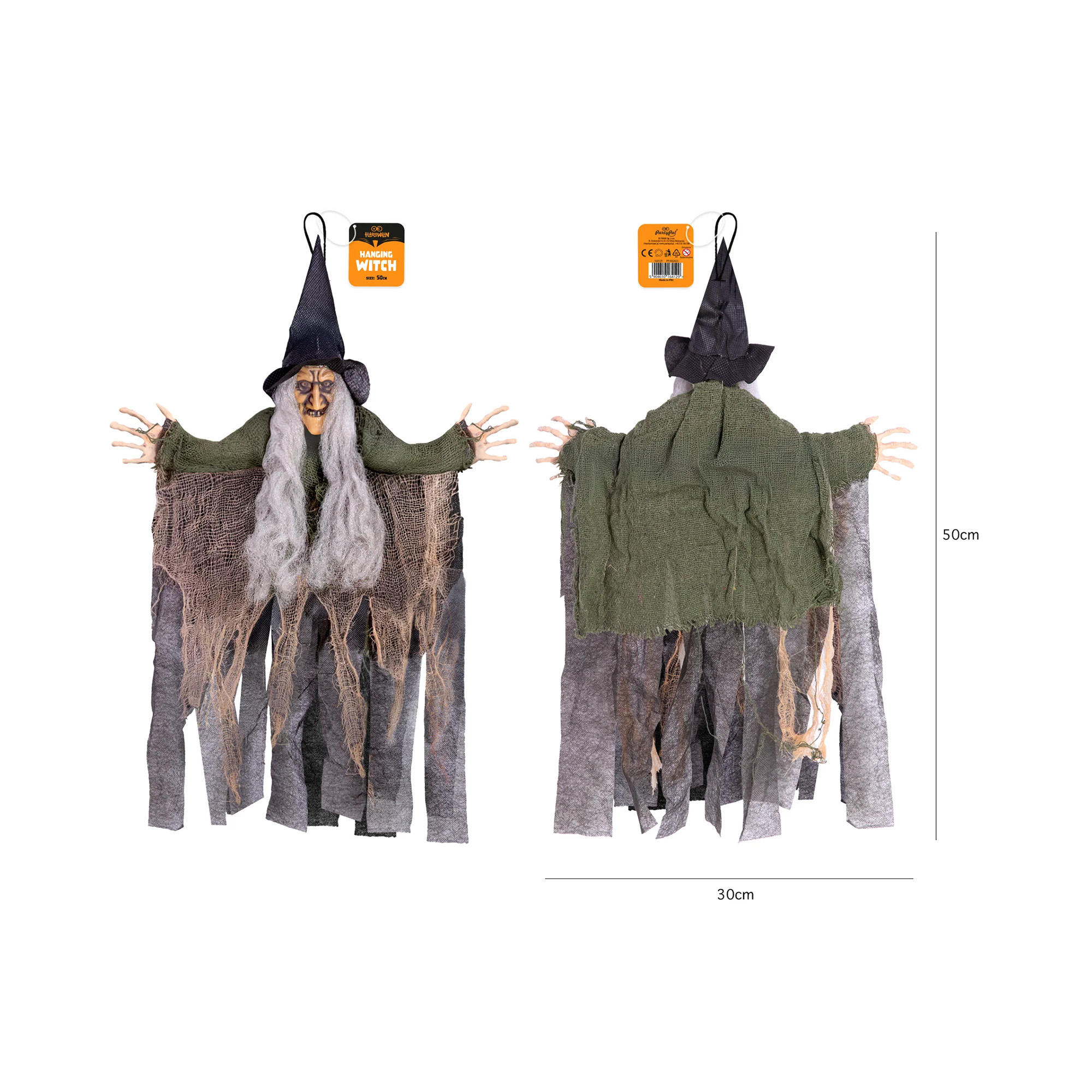 Závěsná dekorace v podobě čarodějnice dodá vašemu prostoru tu správnou temnou atmosféru. Perfektní doplněk na Halloween, strašidelný večírek i oslavu pálení čarodějnic. Strašidelná čarodějnice má dlouhé šedé vlasy a na hlavě špičatý klobouk, za který se dá zavěsit. Zavěste čarodějnici do prostoru a vychutnejte si děsivou atmosféru! Pro další párty doplňky a dekorace se strašidelným motivem můžete navštívit naši tematickou kategorii Halloween nebo Pálení čarodějnic. Výška: 50 cm Balení obsahuje: 1 ks závěsné čarodějnice