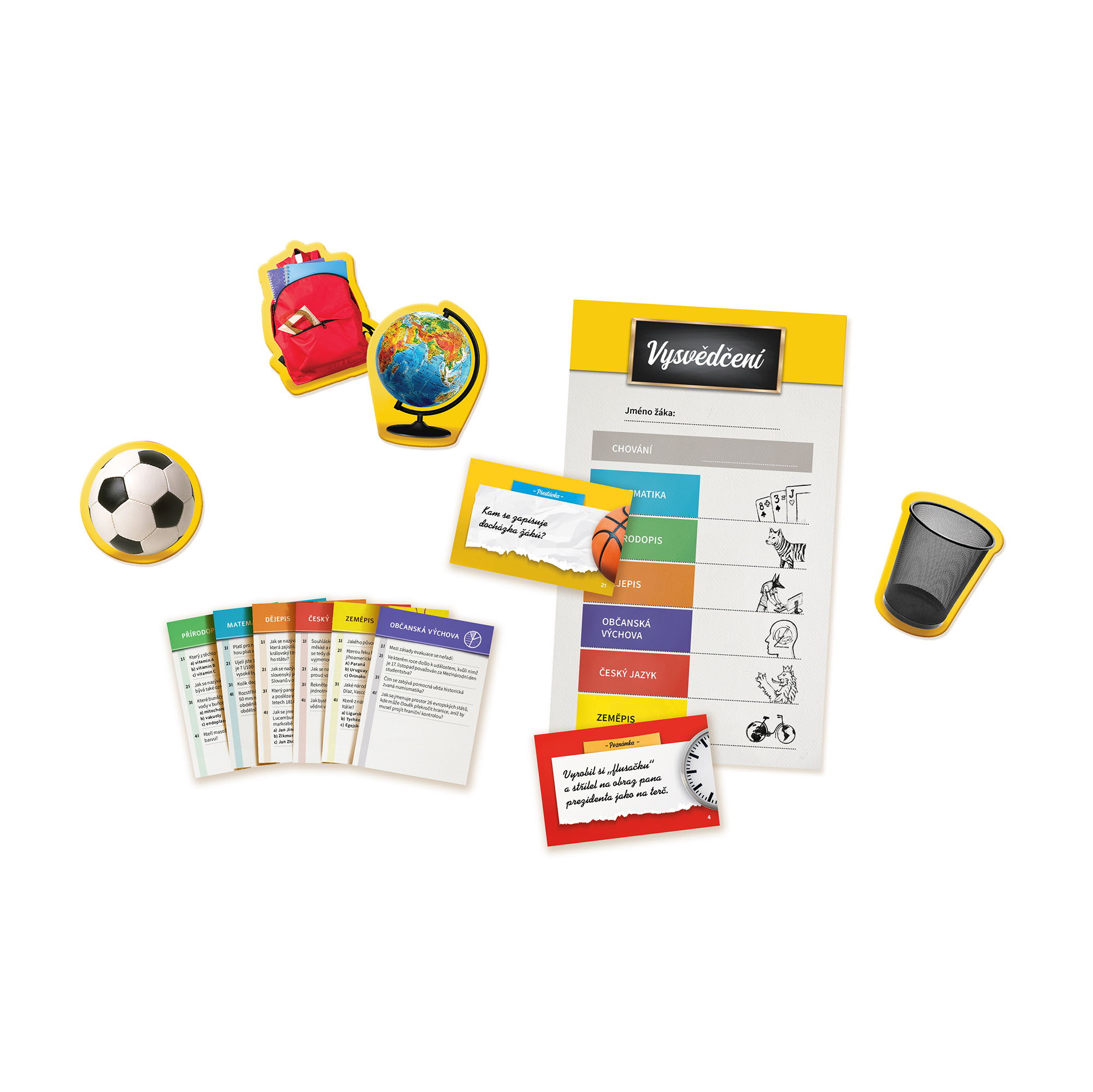Pokračování vědomostní a postřehové hry Zpátky do lavic, které opět prověří vaše znalosti školní látky v předmětech: Český jazyk, Matematika, Dějepis, Zeměpis, Přírodopis a Občanská výchova. Všichni hráči hrají najednou a musí zodpovědět pět otázek z daného předmětu. Pokud na všechny otázky odpoví správně, dostanou na vysvědčení jedničku, za jednu chybu dvojku atd. Ve hře Zpátky do lavic: Taháky a poznámky mají navíc hráči nově možnost využívat a získávat taháky, ale pozor – podvádění může vést k poznámkám a poznámky ke zhoršené známce z chování. Hra Zpátky do lavic: Taháky a poznámky obsahuje: 270 karet s otázkami, 30 karet poznámek, 26 karet přestávek, 30 žetonů předmětů, 30 žetonů taháků, 1 blok s vysvědčeními, 6 tužek, 1 kostku úspěchu a 1 poznámkový bloček. Zpátky do lavic: Taháky a poznámky je samostatná hra, ke které nepotřebujete hru Zpátky do lavic.